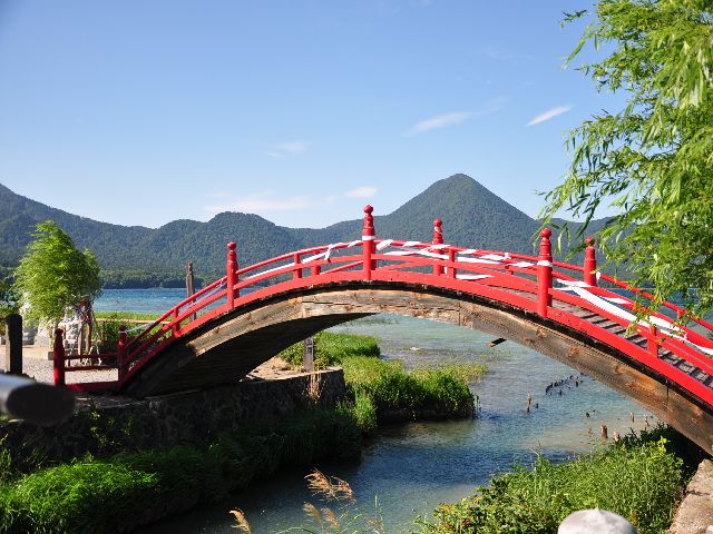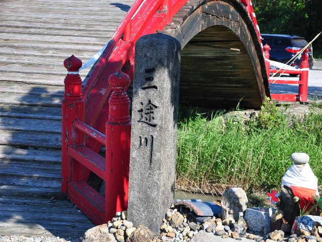 恐山のふもとに、可愛らしい赤い太鼓橋が小川にかかっていたので、渡って写真をとっておりました。